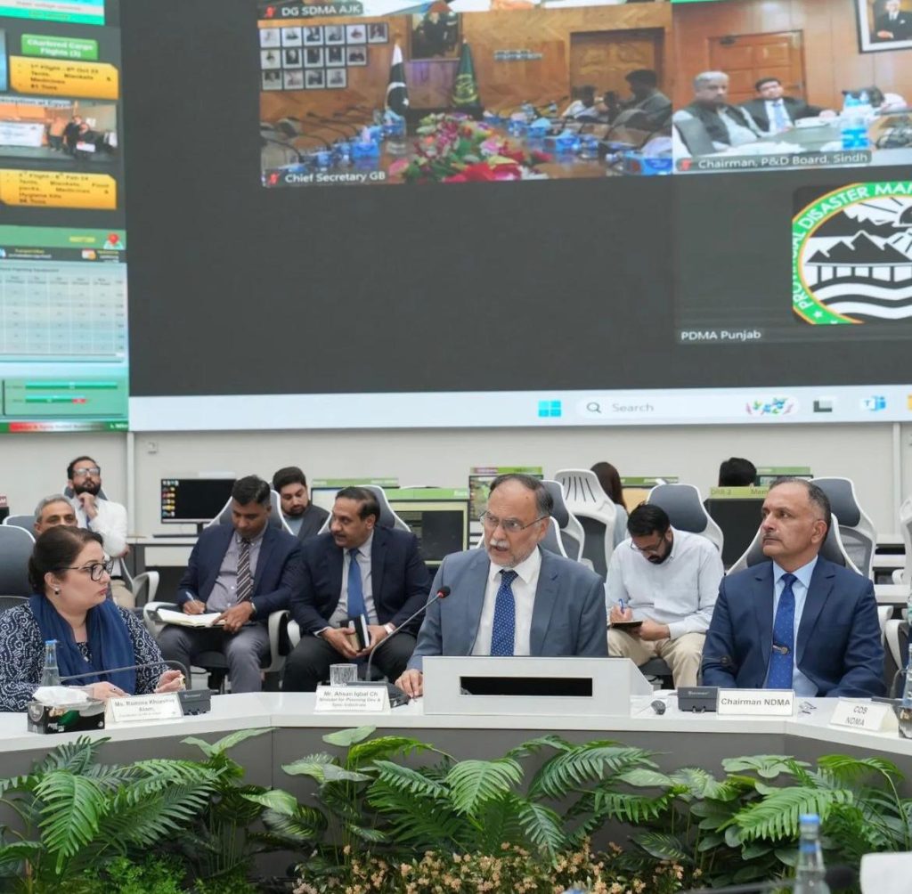 Federal Minister of Planning Development & Special Initiatives Ahsan Iqbal chaired the meeting along with the Coordinator to PM on Climate Change Romina Khurshid Alam at the National Emergency Operation Center, NDMA Headquarters Islamabad.